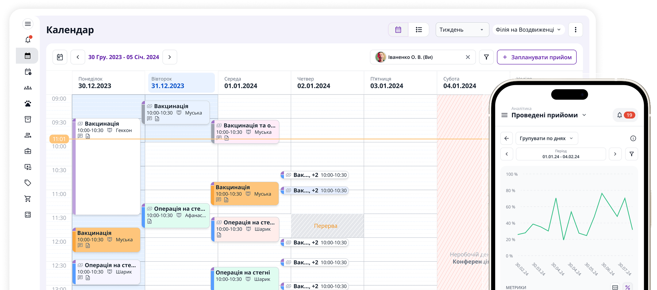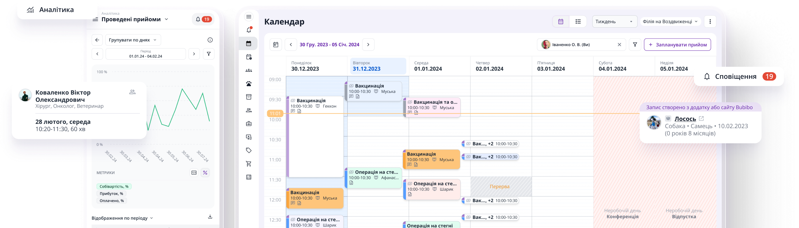 Система покриває всі ключові процеси pet-бізнесу: від управління записами та клієнтською базою до фінансів, складу, продажів, нарахування заробітної плати та аналітичних даних.