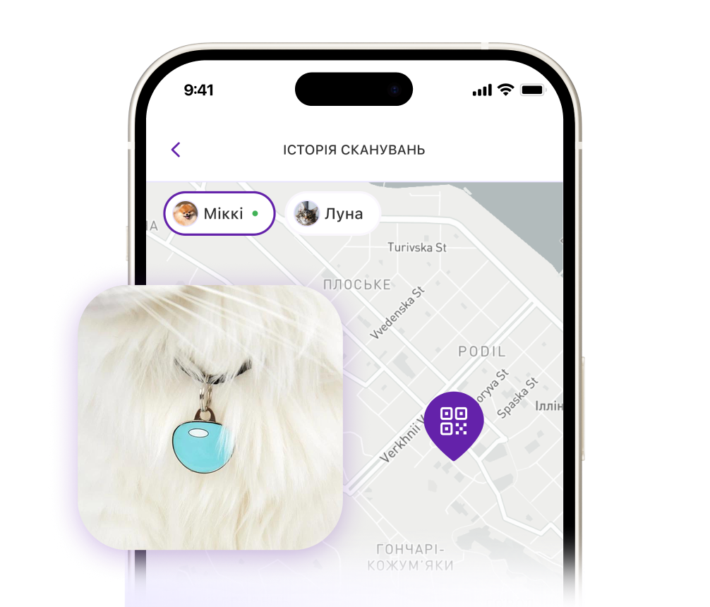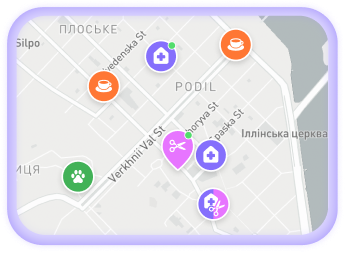 На карті доступні ветеринарні клініки, грумінг-салони, а також pet-friendly кафе та майданчики для вигулу.
