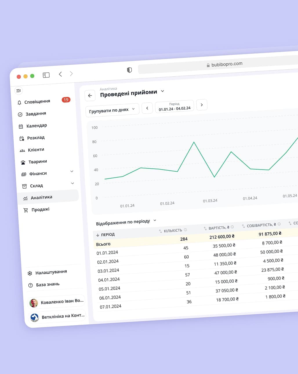 Вивантаження звітів за ключовими показниками роботи ветклініки: проведені прийоми, продажі, надані послуги, продані товари, складські запаси та фінансові показники.